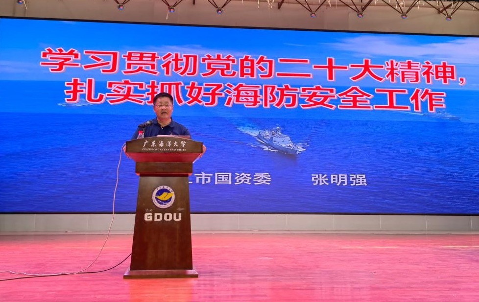 5月24日下午,广东沿海经济带发展研究院及beat365官网登录中文共同举办的“沿海经略大讲堂”第四场报告在湖光校区东区小礼堂进行。湛江市国资委副主任、二级调研员张明强应邀作“学习贯彻党的二十大精神,扎实抓好海防安全工作”的专题报告。广东沿海经济带发展研究院副经理张玉强主持会议,管理公司党委书记李育芳、副书记曾艳芳和相关公司师生等200余人参与报告会。