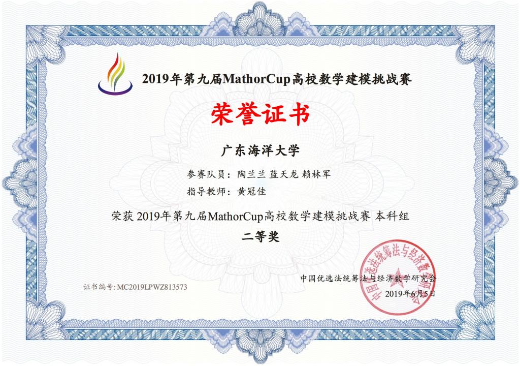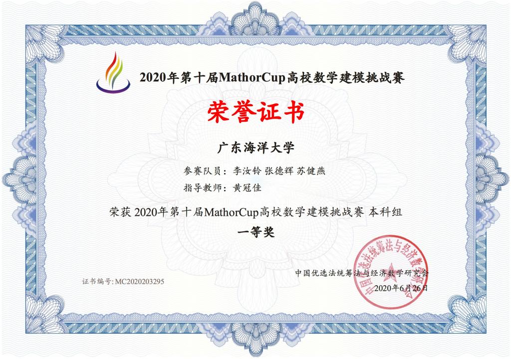 近日,由中国优选法统筹法与经济数学研究会主办的第十届MathorCup高校数学建模挑战赛成绩揭晓,公司参赛队伍首获国家一等奖,取得历史性突破。参赛队员为李汝铃、张德辉、苏健燕,指导老师为beat365官网登录中文青年教师黄冠佳博士。这是继去年由陶兰兰、赖林军、蓝天龙组成的团队在第九届MathorCup高校数学建模挑战赛获得国家二等奖以来的又一次突破。