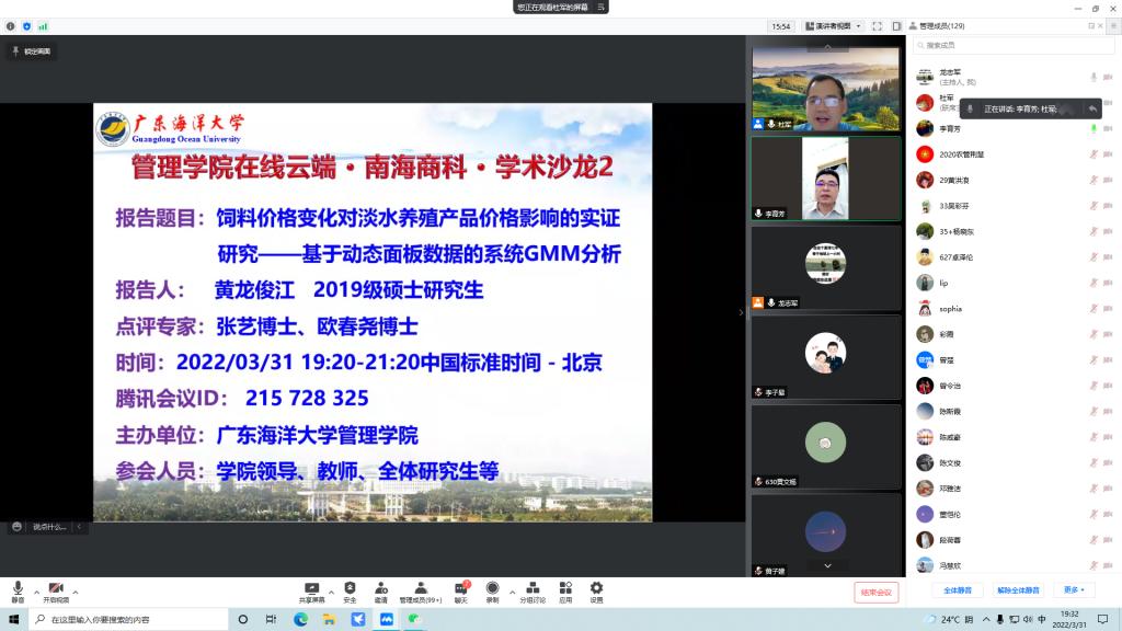 2019级研究生黄龙俊江就其最近研究成果《饲料价格变化对淡水养殖产品价格影响的实证研究》进行汇报分享。张艺博士和欧春尧博士进行了点评并提出修改建议,同时提出,希望同学们学习规范的研究方法和思路,更加重视选题的现实和理论意义,凝练现有研究观点和突出研究边际贡献,要更加重视权威专家观点和经典文献引用,投稿过程要细心和耐心。参会研究生们就论文中变量选择、数据处理等细节问题与黄龙俊江同学进行了深入的互动交流,老师们就讨论过程中同学们的疑惑进行了指导。