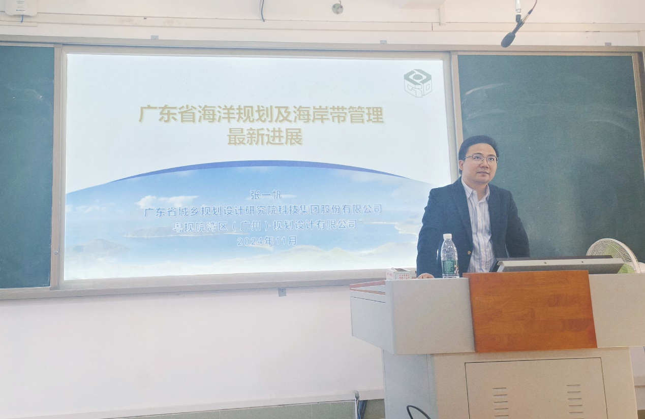 张一帆研究员曾担任广东省海洋发展规划研究中心海域室主任,目前是广东省城乡规划设计研究院科技集团股份有限公司首席研究员(海洋专业),以及粤规院湾区(广州)规划设计有限公司副总经理。报告中,张一帆研究员结合自身的实践经验,对广东省海洋规划发展、海岸带专项规划的最新进展进行了深入解读。他还详细讲解了海岸建筑退缩线制度、海岸线占补管理最新要求以及海岸线资源资产化管理等方面的内容。在报告的答疑环节,与会师生积极提问,就海岸线占补管理的最新要求和涉海课题研究中的具体问题与张一帆研究员展开了热烈讨论。张一帆研究员针对师生们的问题进行了详细的解答,分享了自己的专业见解和经验。