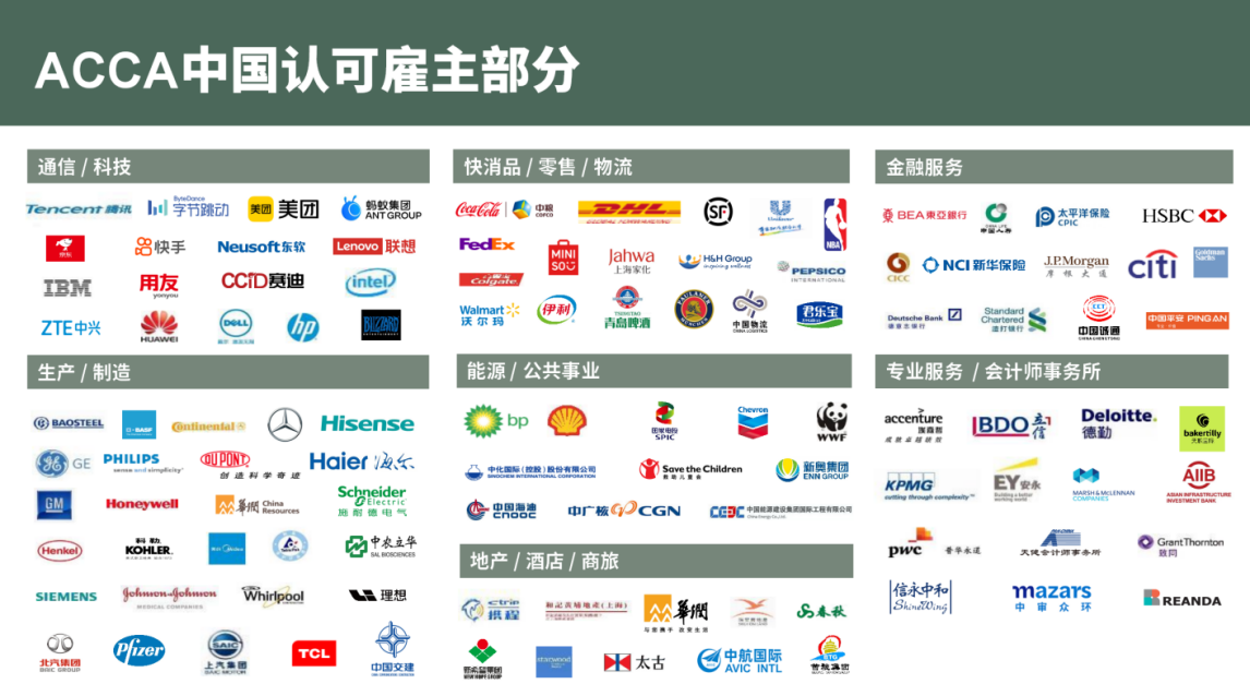 ACCA在全球的认可雇主企业 7959 家,覆盖事务所、金融服务、科技等众多500强企业,这些企业在同等条件下会优先录用ACCA学员。ACCA持证人得到知名500强企业的亲睐和优先录用。