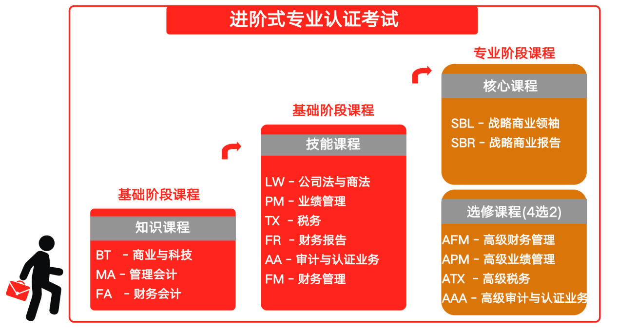 如图1所示,ACCA考试共需完成13门科目的考试,其中前9门为基础阶段,后4门为专业阶段。综合学习时间为:2-4年。